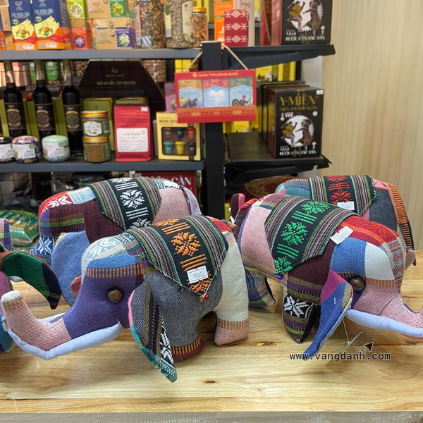 Voi thổ cẩm để bàn là một sản phẩm thủ công được chế tác từ vải thổ cẩm truyền thống của người dân Tây Nguyên. Con voi, một biểu tượng linh thiêng và gần gũi với cuộc sống của người dân vùng cao nguyên, được khắc họa tỉ mỉ, sau đó được phủ lên một lớp áo bằng vải thổ cẩm nhiều màu sắc đã tạo điểm nhấn nổi bật cho sản phẩm, mang đến không gian sống sự tươi vui và ấm áp. Voi thổ cẩm là món quà ý nghĩa để bạn bè, người thân lưu giữ những kỷ niệm đẹp về vùng đất Tây Nguyên
